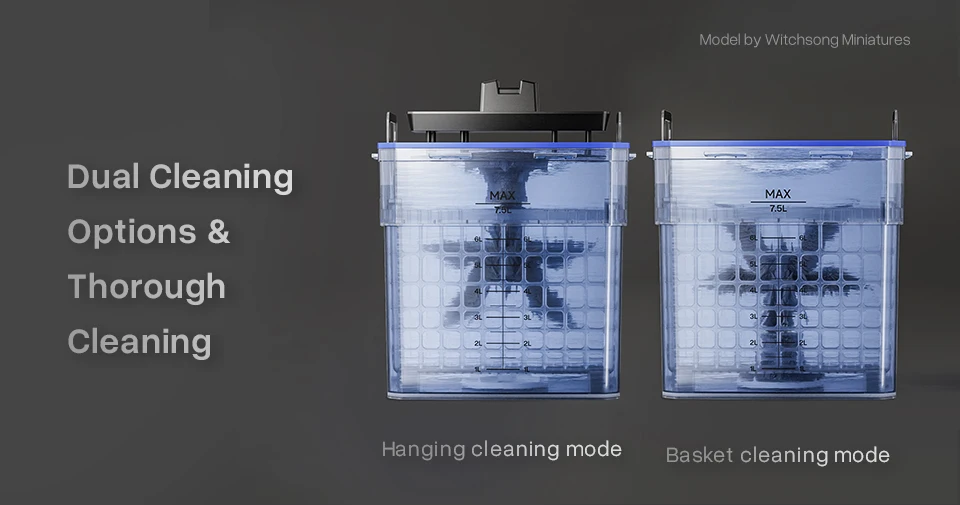 Режим подвесной очистки: Закрепите платформу на кронштейнах и начните очистку.Новые регулируемые опорные кронштейны легко адаптируются для установки платформ размером до 10 дюймов, обеспечивая идеальную совместимость с вашими моделями.Этот режим позволяет использовать максимальный объем стирки 214 мм x 135 мм x 180 мм.