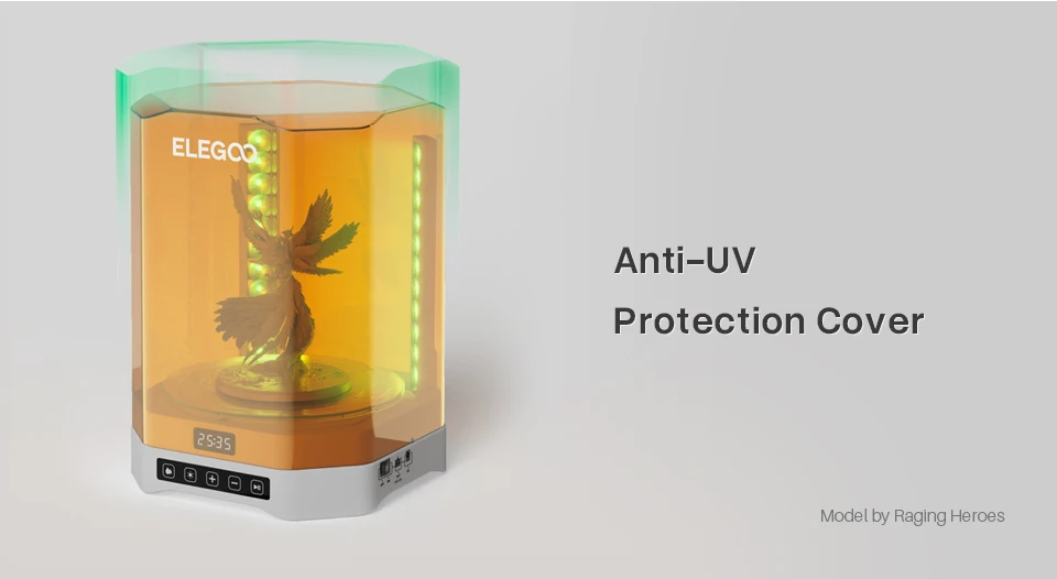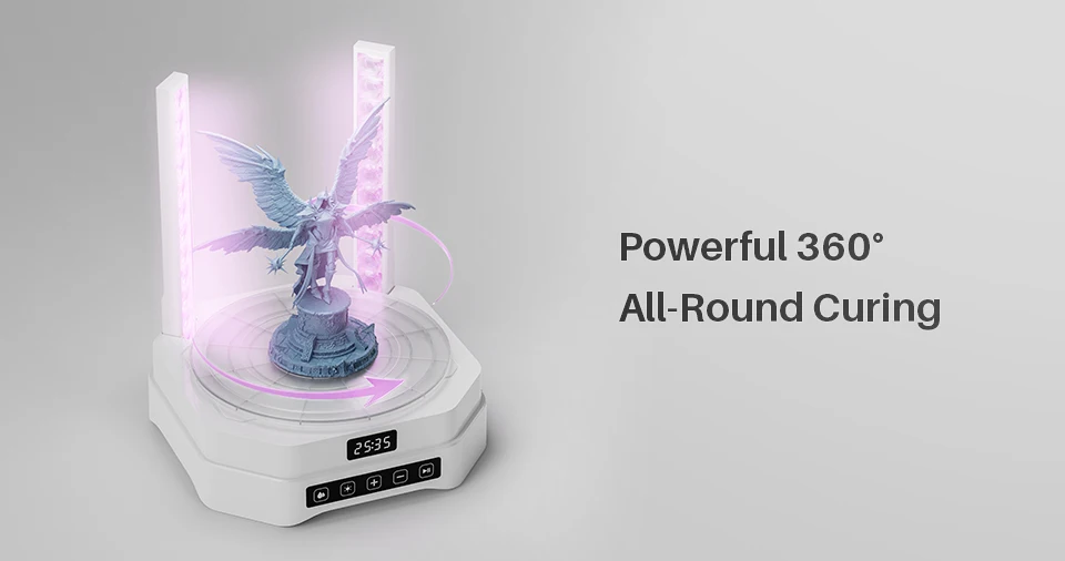 Мощный 360° Всестороннее отверждение Система с 360-градусным охватом° Вращающийся поворотный стол с 24 ультрафиолетовыми лампами 405 нм обеспечивает быстрое и равномерное отверждение, безупречно фиксируя каждую сложную деталь.Увеличенный одиночный светодиод под прозрачным поворотным столом обеспечивает равномерное отверждение сверху вниз без слепых зон, что приводит к улучшению качества печати.